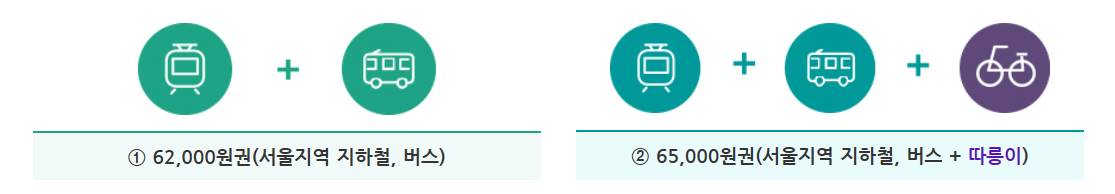 | 한 달 62,000원 | · 서울시 면허 시내버스 (서울시 버스이기만 하면 타는 지역은 서울이 아니어도 이용 가능) · 서울시 면허 마을버스 · 서울 지하철 및 수도권 전철 (서울시 내 구간에 해당) · 따릉이 1시간 이용권 한 달 사용 가능 · 한강 리버 버스 |